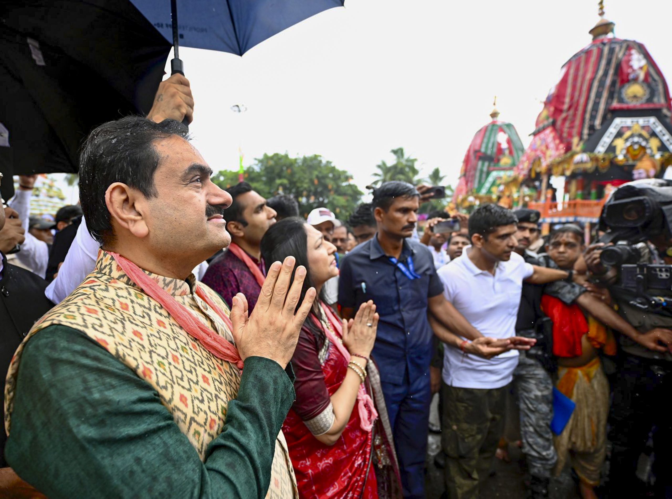 **EDS: THIRD PARTY IMAGE** In this image posted by @gautam_adani via X on June 28, 2025, Adani Group Chairman Gautam Adani offers prayers with wife Priti and son Karan during the ‘Rath Yatra’ festival near Gundicha Temple, in Puri, Odisha. (@gautam_adani on X via PTI Photo) (PTI06_28_2025_000173B)