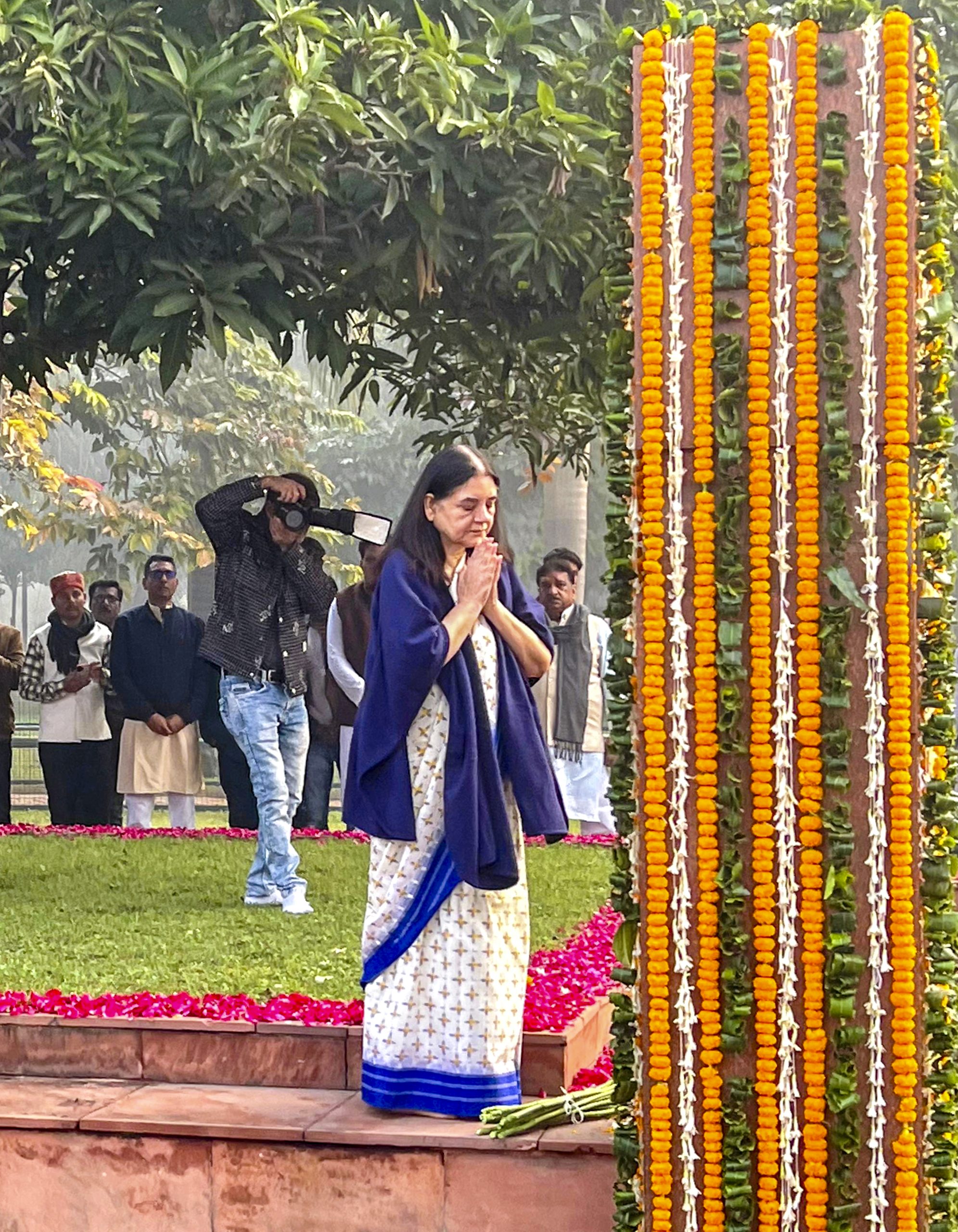New Delhi: BJP leader Maneka Gandhi pays tribute to former Lok Sabha MP and her husband Sanjay Gandhi on his birth anniversary, in New Delhi, Sunday, Dec. 14, 2025. (PTI Photo)(PTI12_14_2025_000052B)