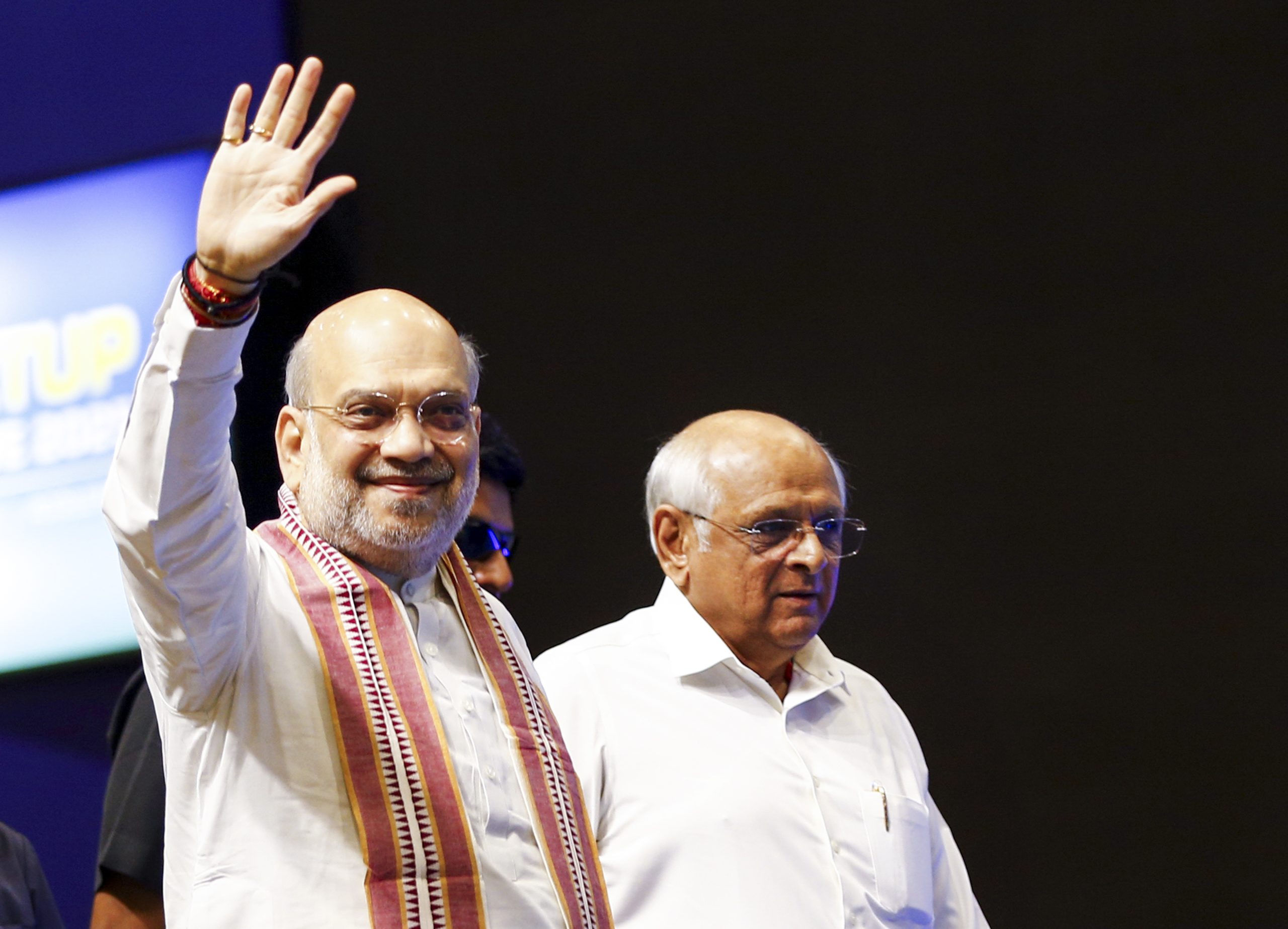 Gandhinagar: Union Home Minister Amit Shah greets the gathering as Gujarat Chief Minister Bhupendra Patel looks on during the state's 'Startup Conclave 2025', in Gandhinagar, Gujarat, Tuesday, Sept. 23, 2025. (PTI Photo) (PTI09_23_2025_000238B)