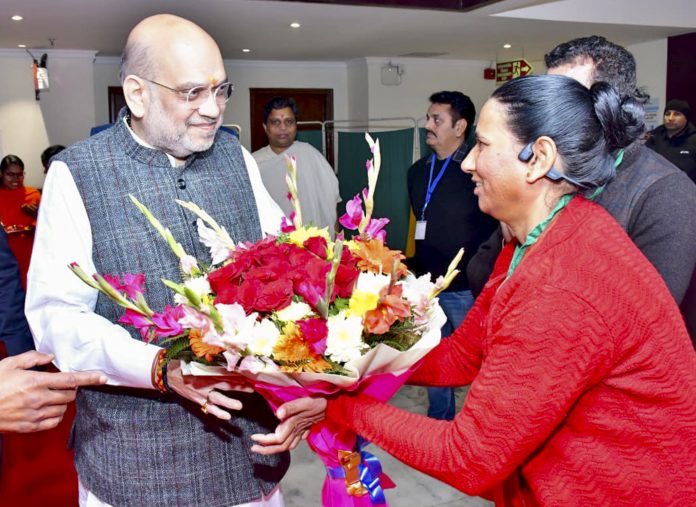 Haridwar: Union Home Minister Amit Shah being welcomed as he arrives at Patanjali Yogpeeth, in Haridwar, Wednesday, Jan. 21, 2026. (PTI Photo) (PTI01_21_2026_000520B)