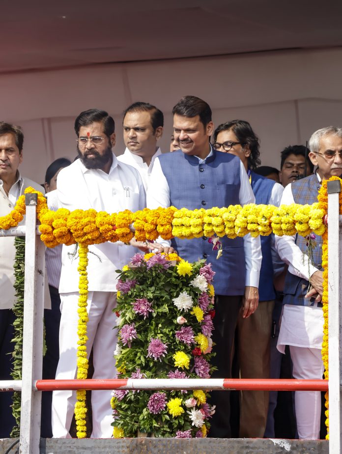 Mumbai: Maharashtra Chief Minister Devendra Fadnavis, Deputy CM Eknath Shinde and Legislative Assembly Speaker Rahul Narwekar, center, during the launch of Boring Machine for Orange Gate to Marine Drive Urban Road Tunnel Project, in Mumbai, Maharashtra, Wednesday, Dec. 3, 2025. (PTI Photo) (PTI12_03_2025_000328B)
