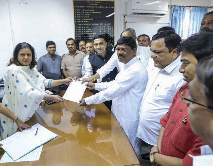 North Goa: BJP MLA Ganesh Gaonkar files his nomination for the election to the post of Goa assembly speaker in the presence of Goa Chief Minister Pramod Sawant, at Porvorim, in North Goa district, Tuesday, Sept. 23, 2025. (PTI Photo)(PTI09_23_2025_000333B)