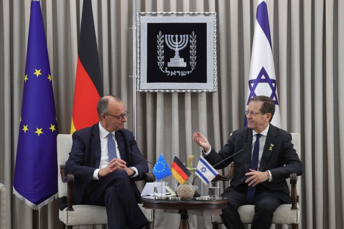 German Chancellor Friedrich Merz, left, and Israel's President Isaac Herzog, right, during their meeting at the President's residence in Jerusalem, Israel, Saturday, Dec. 6, 2025. AP/PTI(AP12_07_2025_000023B)