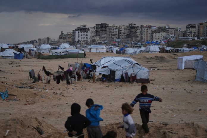 Palestinian children play next to tents in a makeshift camp for displaced people set up on the beach in Gaza City, Tuesday, Dec. 16, 2025. AP/PTI(AP12_16_2025_000432B)