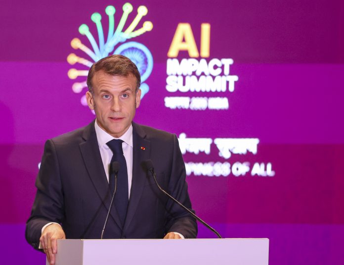 **EDS: THIRD PARTY IMAGE** In this image received on Feb. 19, 2026, France President Emmanuel Macron addresses the gathering during the India AI Impact Summit 2026, in New Delhi. (PMO via PTI Photo)(PTI02_19_2026_000218B)