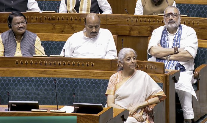 **EDS: THIRD PARTY IMAGE; SCREENGRAB VIA SANSAD TV** New Delhi: Finance Minister Nirmala Sitharaman, BJP MPs Giriraj Singh and others in the Lok Sabha during the second part of Budget session of Parliament, in New Delhi, Wednesday, March 11, 2026. (Sansad TV via PTI Photo)(PTI03_11_2026_000316B)