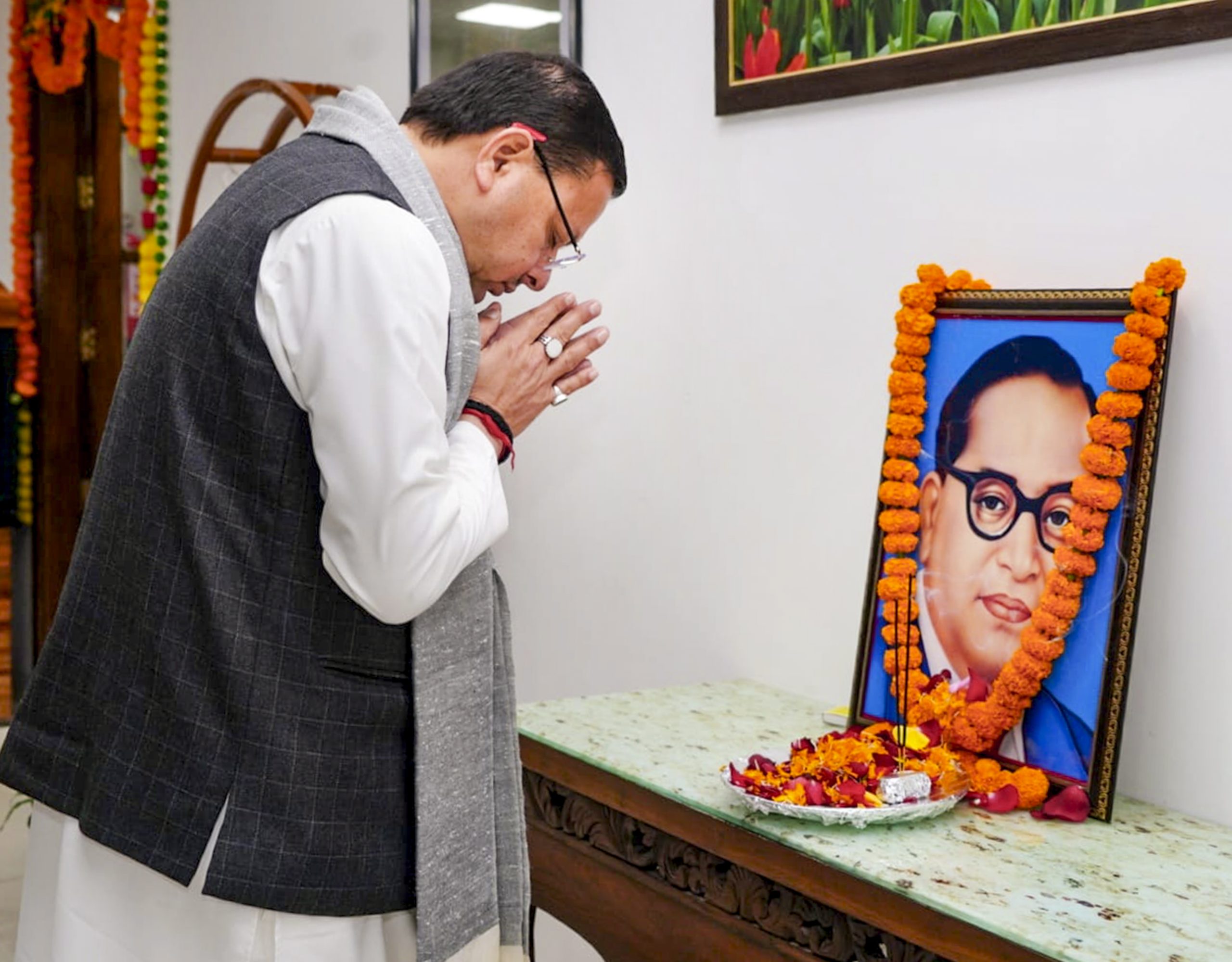 **EDS: THIRD PARTY IMAGE** In this image posted on Dec. 6, 2025, Uttarakhand CM Pushkar Singh Dhami pays tribute to BR Ambedkar on his 69th death anniversary, observed as ‘Mahaparinirvan Diwas’. (@pushkardhami/X via PTI Photo)(PTI12_06_2025_000236B)