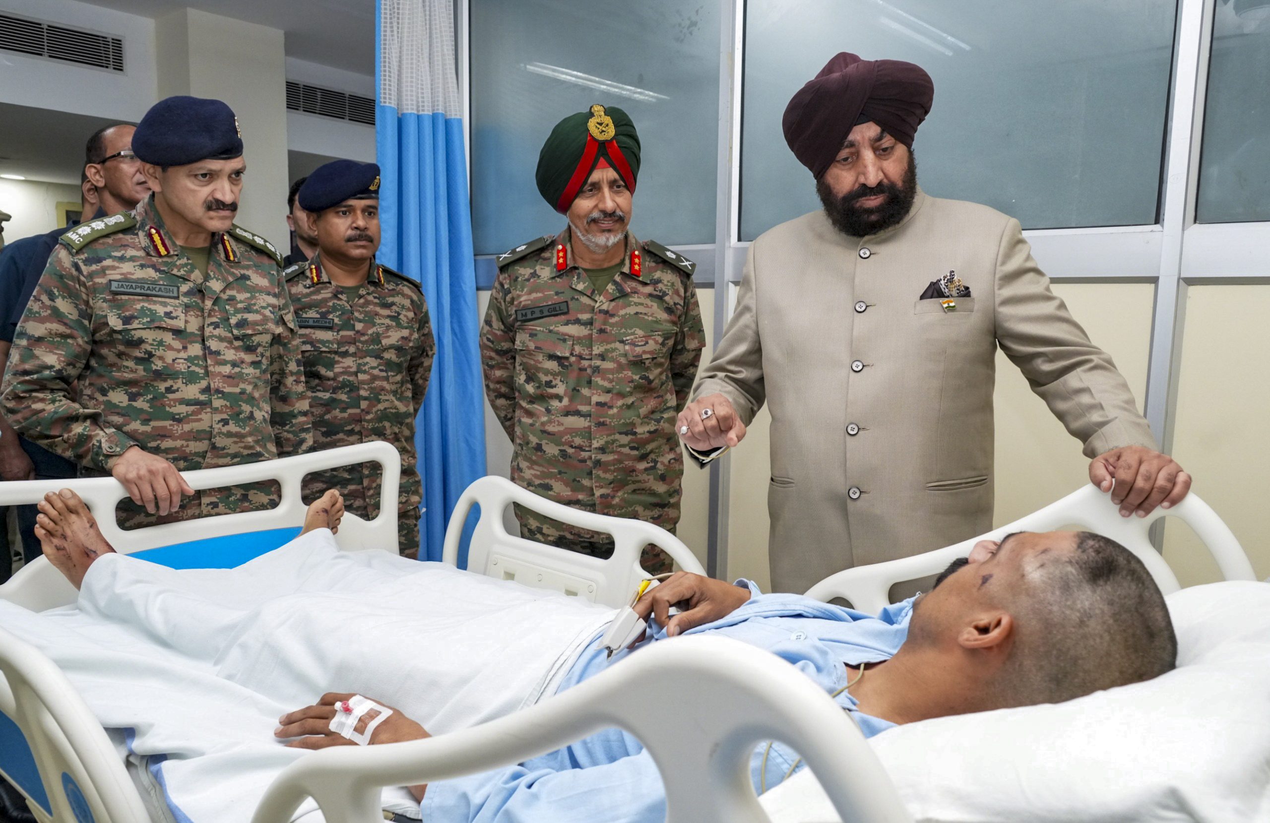 Dehradun: Uttarakhand Governor Lt. General Gurmeet Singh (Retd.) during a visit to the military hospital, where soldiers injured in recent flash floods at the disaster-hit Uttarkashi district are being treated, in Dehradun, Friday, Aug. 8, 2025. (PTI Photo) (PTI08_08_2025_000357B)