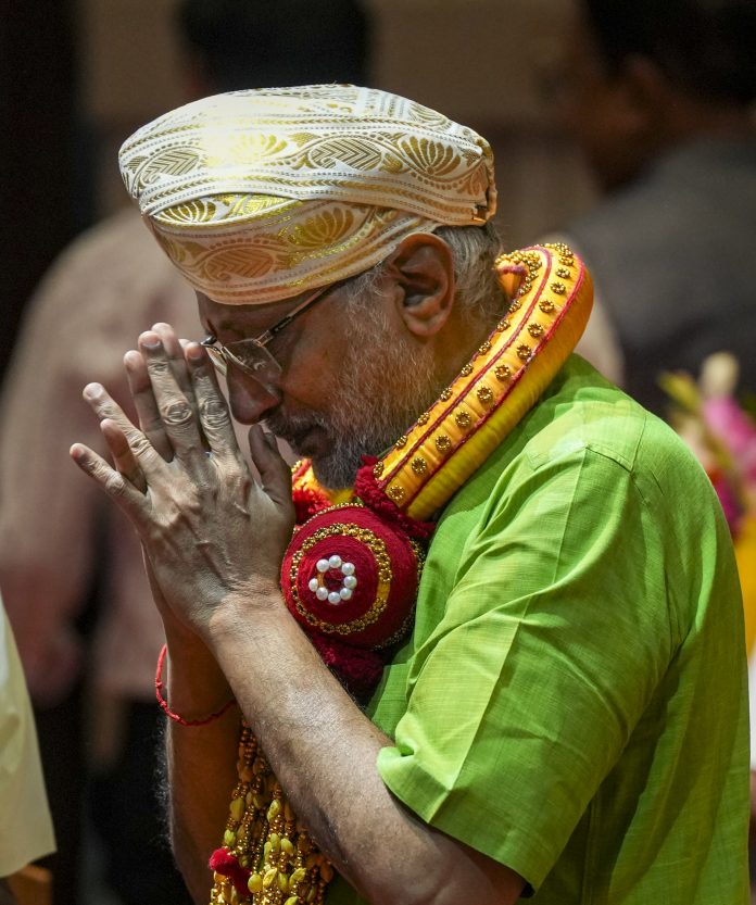 राधाकृष्णन, जिनका उपराष्ट्रपति निर्वाचित होना तय माना जा रहा है, भाजपा नेतृत्व वाले गठबंधन के केंद्रीय मंत्रियों और अन्य नेताओं के साथ पहुंचे।