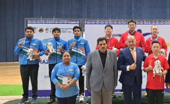 अनमोल (580), आदित्य मल्हरा (579) और एशियाई खेलों के स्वर्ण पदक विजेता सौरभ चौधरी (576) वाली पुरुष टीम ने कुल 1,735 अंक बनाकर दूसरा स्थान हासिल किया। चीन ने 1,744 अंकों के साथ स्वर्ण पदक जीता।