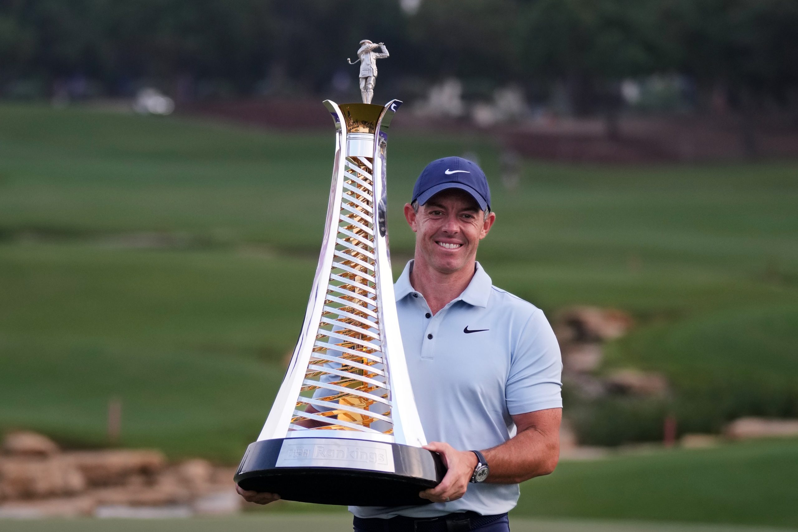 Rory McIlroy of Northern Ireland poses with the Race to Dubai trophy in Dubai, United Arab Emirates, Sunday, Nov. 16, 2025. AP/PTI(AP11_16_2025_000353B)