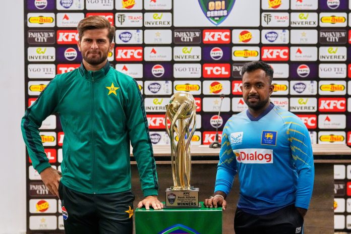 Pakistan's skipper Shaheen Shah Afridi, left, and his Sri Lankan counterpart Charith Asalanka pose for photograph with the ODI series trophy, in Rawalpindi, Pakistan, Monday, Nov. 10, 2025. AP/PTI(AP11_10_2025_000507B)