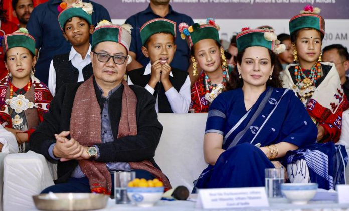 **EDS: THIRD PARTY IMAGE** In this image released by @KirenRijiju via X on June 27, 2025, Union Minister Kiren Rijiju with BJP MP Kangana Ranaut during the foundation stone laying for Indoor Stadiums at GSSS Pooh & GSSS Giabong under the PMJVK Scheme, in Kinnaur district of HP. (@KirenRijiju via PTI Photo) (PTI06_27_2025_000319B)