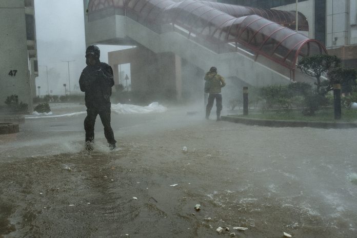 Members of media walk through the floodwaters in Heng Fa Chuen area as Super Typhoon Ragasa approaches in Hong Kong, Wednesday, Sept. 24, 2025. AP/PTI(AP09_24_2025_000016B)