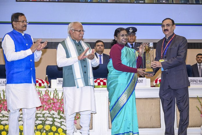 **EDS: THIRD PARTY IMAGE** In this image released on Dec. 14, 2025, President Droupadi Murmu felicitates an awardee during the presentation of ‘National Energy Conservation Awards 2025’ and ‘National Painting Competition on Energy Conservation’ prizes, in New Delhi. Union Power Minister Manohar Lal Khattar is also seen. (Rashtrapati Bhavan via PTI Photo) (PTI12_14_2025_000179B)