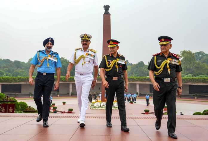 **EDS, YEARENDERS 2025: EDITOR’S PICK** New Delhi: Chief of Defence Staff (CDS) General Anil Chauhan, Chief of the Army Staff (COAS) General Upendra Dwivedi, Chief of the Naval Staff (CNS) Admiral Dinesh K. Tripathi and Chief of the Air Staff (CAF) Air Chief Marshal A. P. Singh at the National War Memorial after paying tribute on the 93rd Indian Air Force Day, in New Delhi, Wednesday, Oct. 8, 2025. (PTI Photo/Arun Sharma) (PTI10_08_2025_000059B)(PTI12_31_2025_000368B)