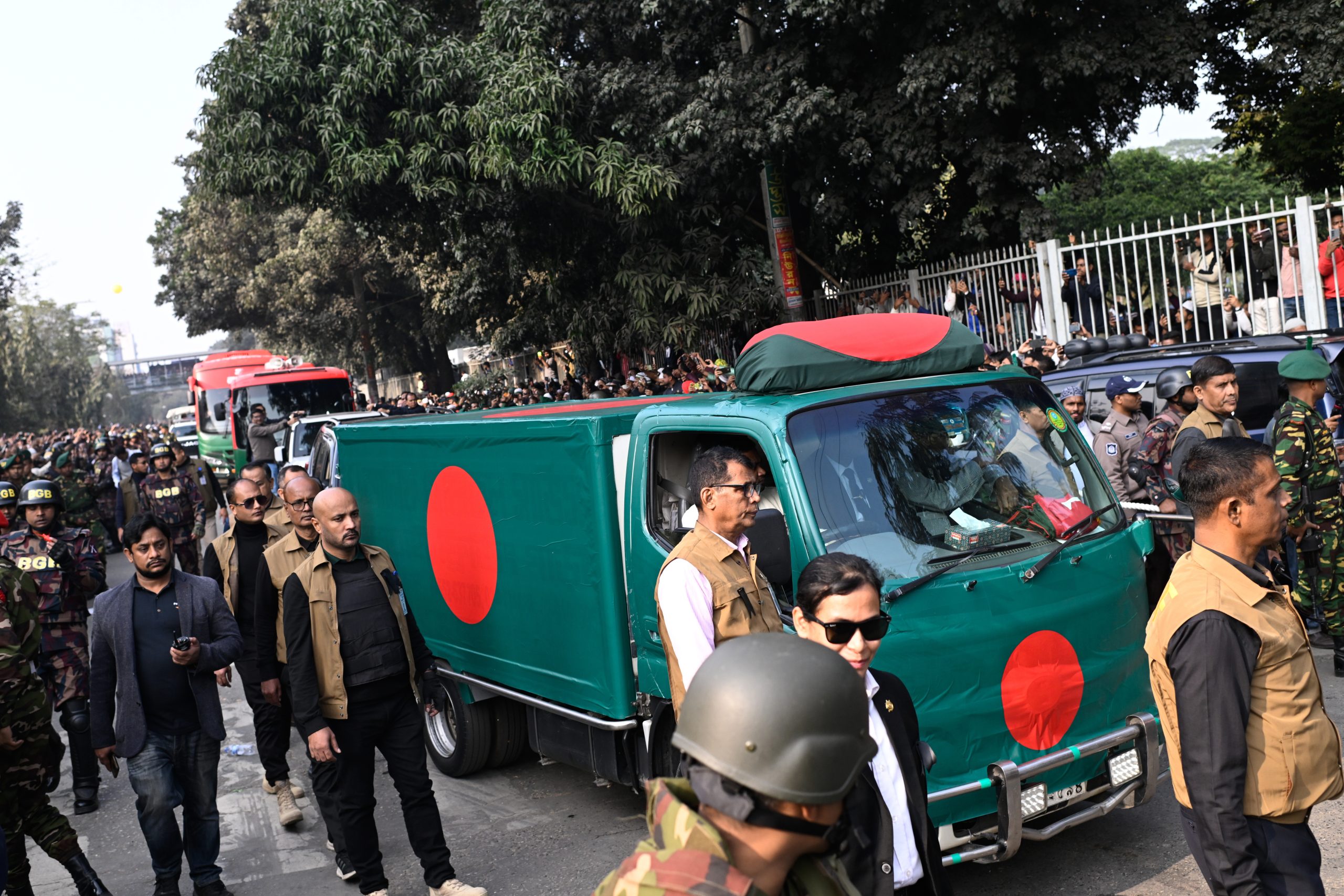 Security personnel escort an ambulance covered with the Bangladesh flag carrying the body of former Prime Minister Khaleda Zia for her funeral prayers, in Dhaka, Bangladesh, Wednesday, Dec. 31, 2025. AP/PTI(AP12_31_2025_000203B)