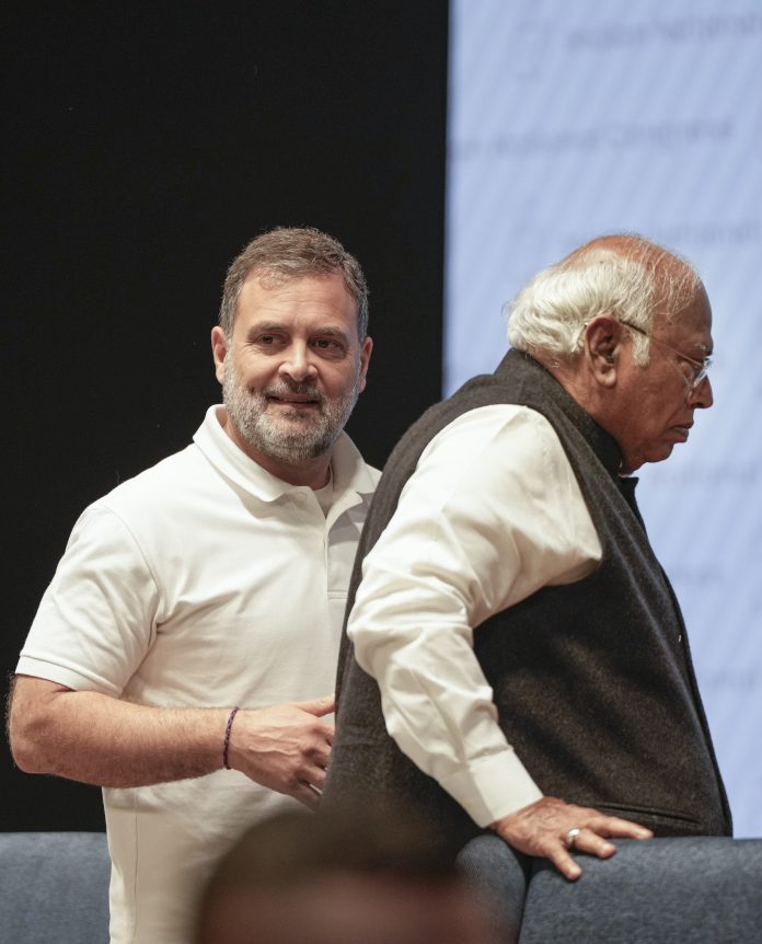 New Delhi: Congress President Mallikarjun Kharge, right, and party leader Rahul Gandhi during a press conference after the Congress Working Committee (CWC) meeting, in New Delhi, Saturday, Dec. 27, 2025. (PTI Photo/Atul Yadav) (PTI12_27_2025_000219B)