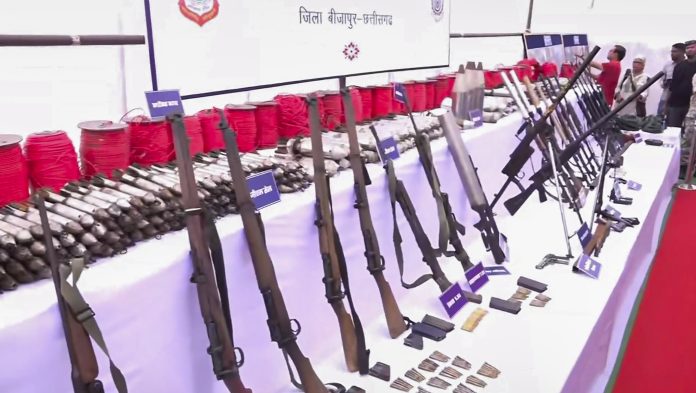**EDS: GRAB VIA PTI VIDEOS** Bijapur: Weapons seized by police after anti-Naxal operations, on display in Bijapur, Chhattisgarh, Wednesday, May 14, 2025. (PTI Photo) (PTI05_14_2025_000252B)