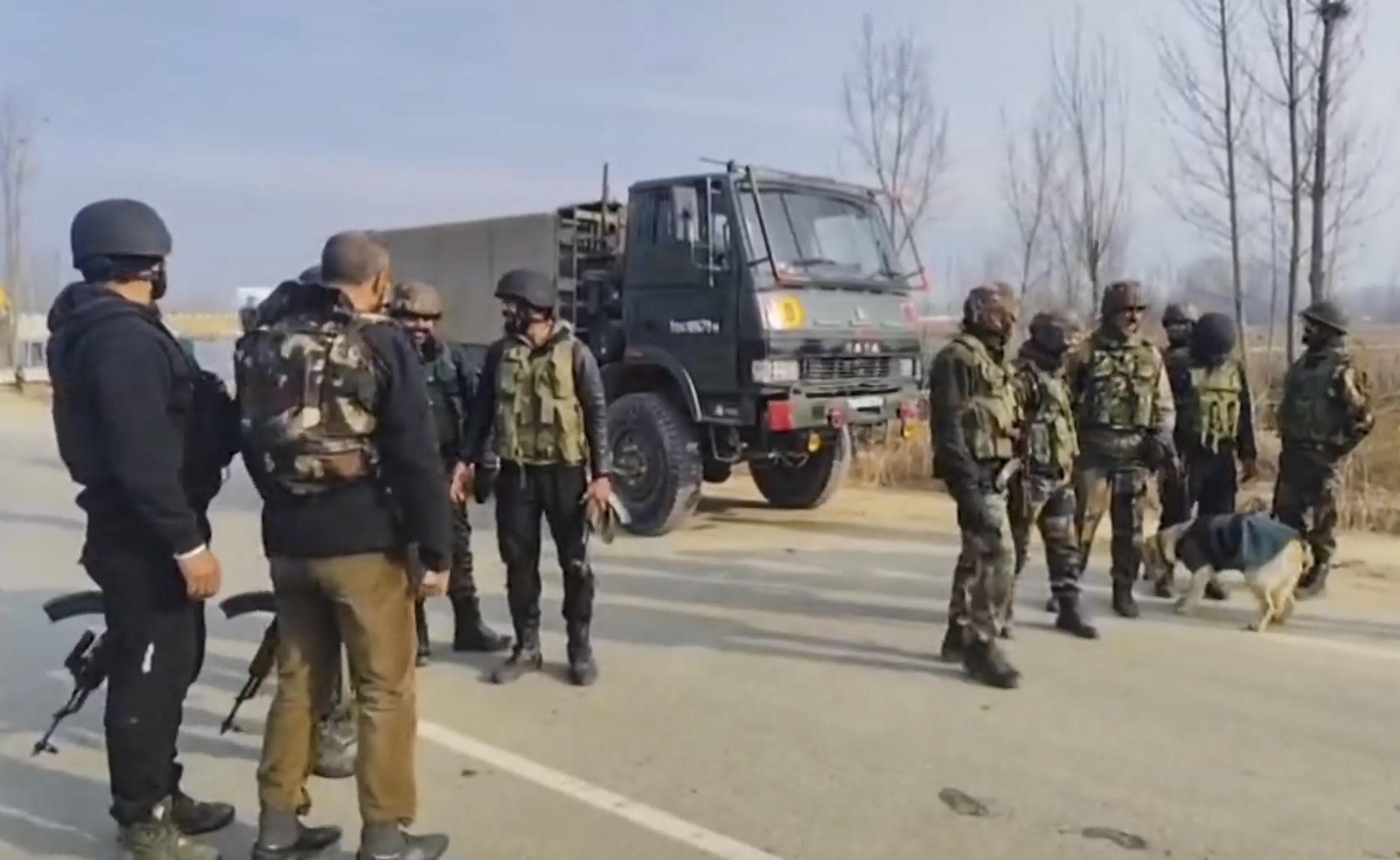 **EDS: SCREENGRAB VIA PTI VIDEOS** Srinagar: Security personnel stand guard after neutralising Improvised Explosive Device (IED) planted by terrorists on the Srinagar-Baramulla highway in Jammu and Kashmir, Wednesday, Feb. 18, 2026. (PTI Photo) (PTI02_18_2026_000235B)