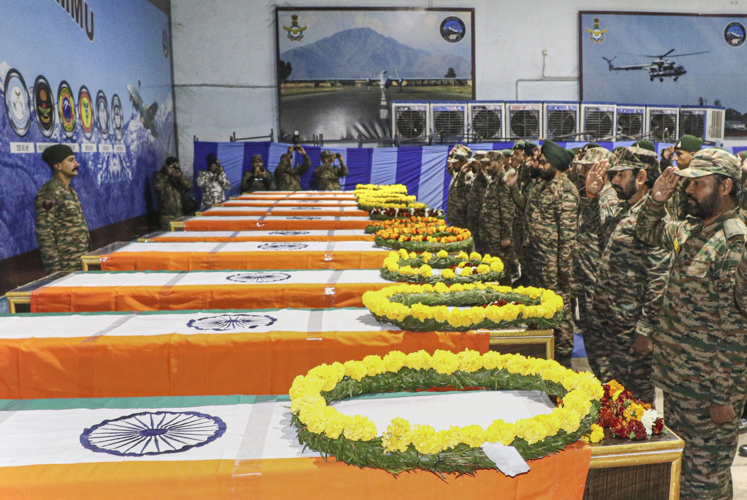 जम्मू ज़ोन के पुलिस महानिरीक्षक भीम सेन टूटी और जम्मू के सीआरपीएफ के पुलिस महानिरीक्षक आर. गोपाल कृष्ण राव ने भी तिरंगे में लिपटे ताबूतों पर पुष्पचक्र अर्पित किए।