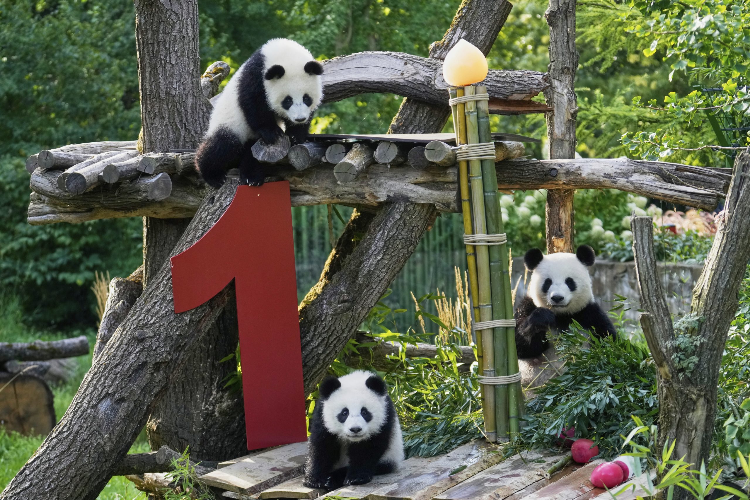 The twin Panda cubs Leni and Lotti, left, play at the Panda Garden during their first birthday party at the Zoo in Berlin, Germany, Friday, Aug. 22, 2025. AP/PTI(AP08_22_2025_000157B)