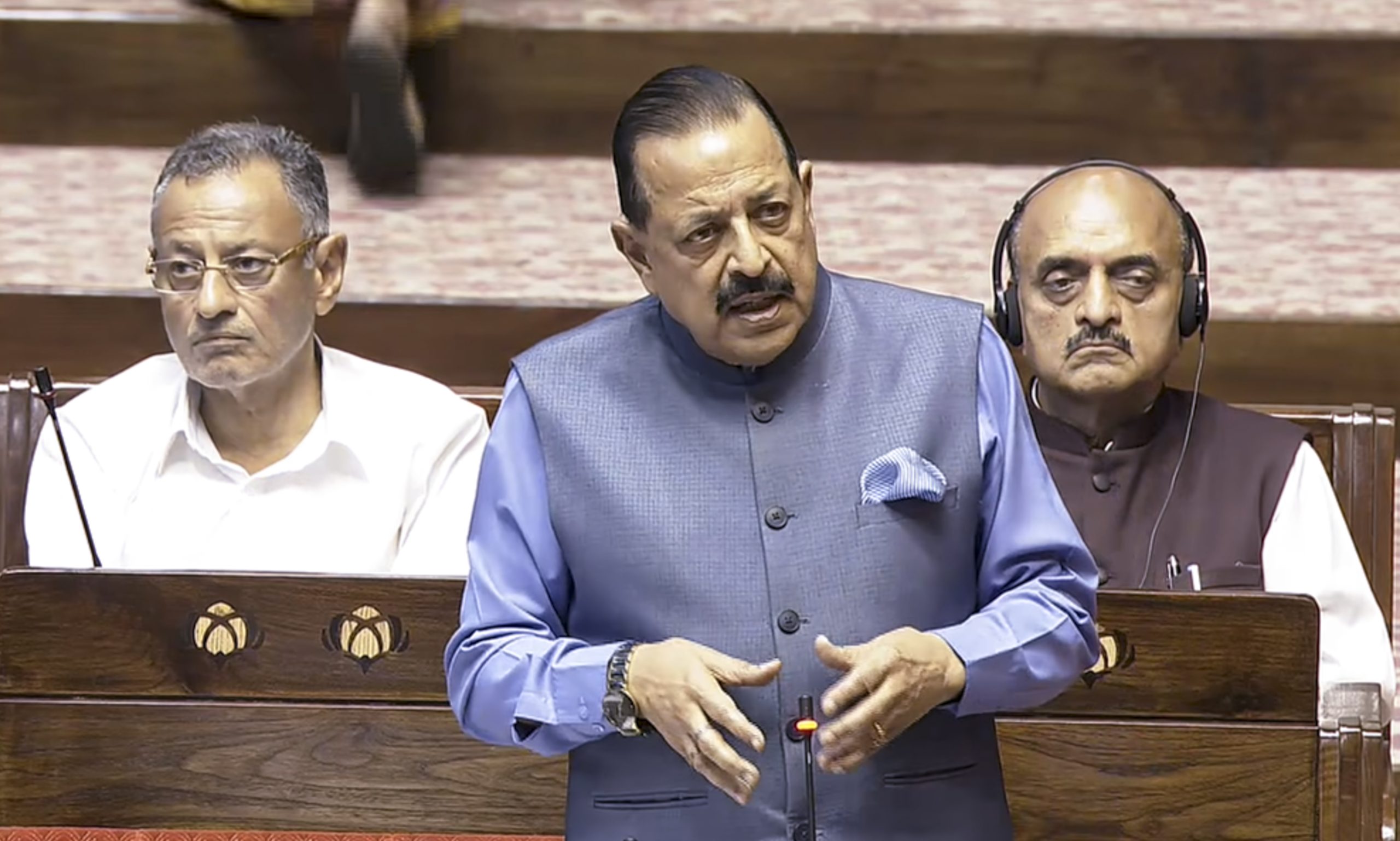 **EDS: THIRD PARTY IMAGE; SCREENGRAB VIA SANSAD TV** New Delhi: Union Minister Jitendra Singh speaks in the Rajya Sabha during the second part of the Budget session of Parliament, in New Delhi, Thursday, April 2, 2026. (Sansad TV via PTI Photo)(PTI04_02_2026_000076B)