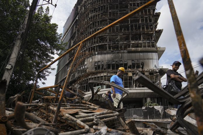 Kathmandu: People outside the charred Hilton Hotel after it was vandalised during the anti-government protests, in Kathmandu, Nepal, Friday, Sept. 12, 2025. (PTI Photo/Arun Sharma)(PTI09_12_2025_000050B)