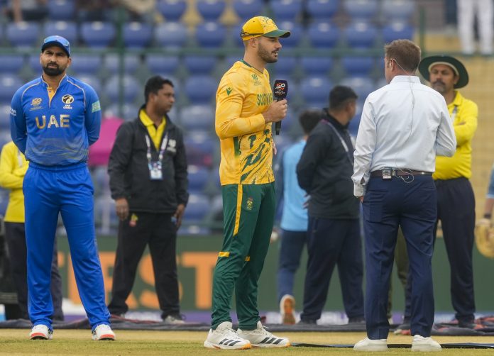 नई दिल्ली, 18 फरवरी (पीटीआई) Aiden Markram की अगुआई वाली South Africa national cricket team ने बुधवार को यहां टी20 विश्व कप मुकाबले में United Arab Emirates national cricket team के खिलाफ टॉस जीतकर पहले गेंदबाजी करने का फैसला किया।