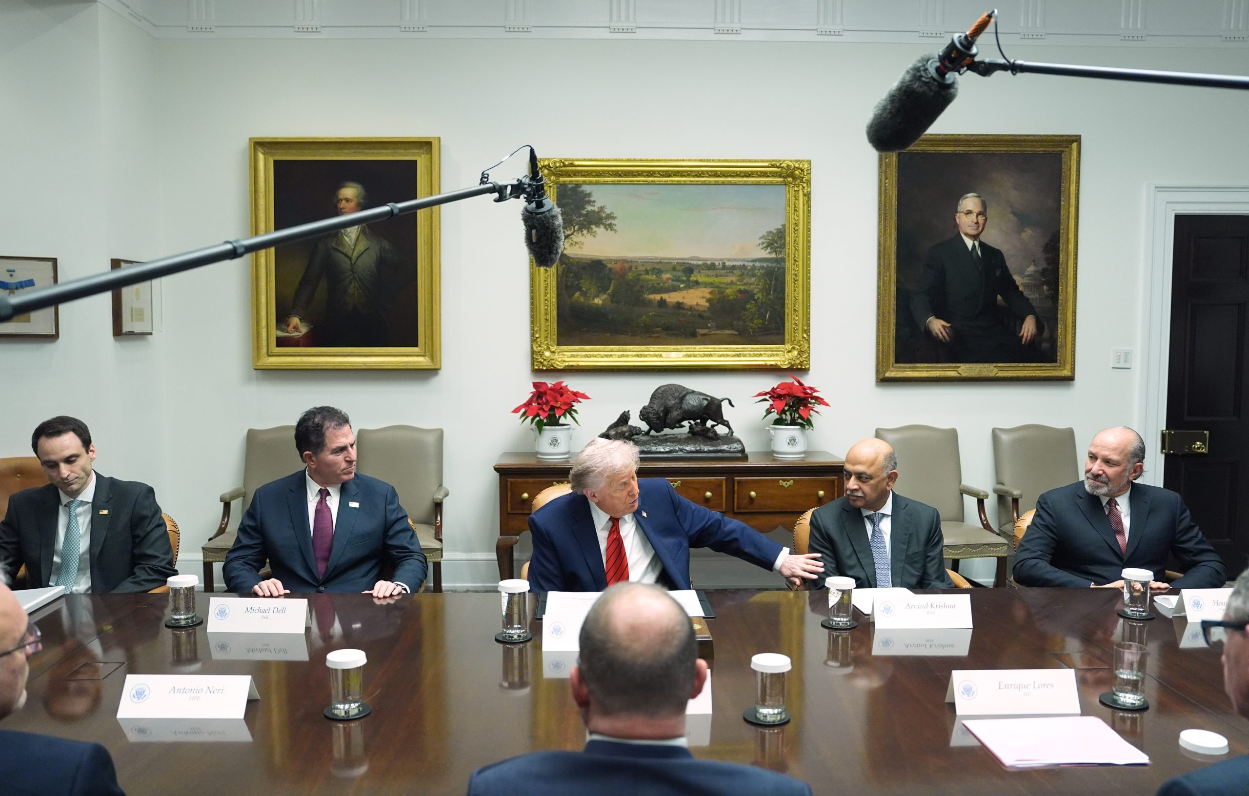 Flanked by Science Advisor to the President Michael Kratsios, left, CEO of Dell, Michael Dell, second left, CEO of IBM Arvind Krishna, second right, and Secretary of Commerce Howard Lutnick, right, listen to President Donald Trump during a roundtable discussion with business leaders in the Roosevelt Room of the White House, Wednesday, Dec. 10, 2025, in Washington. AP/PTI(AP12_11_2025_000004B)