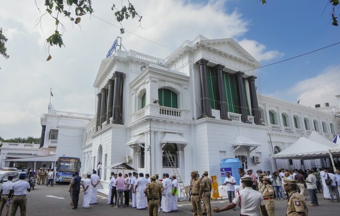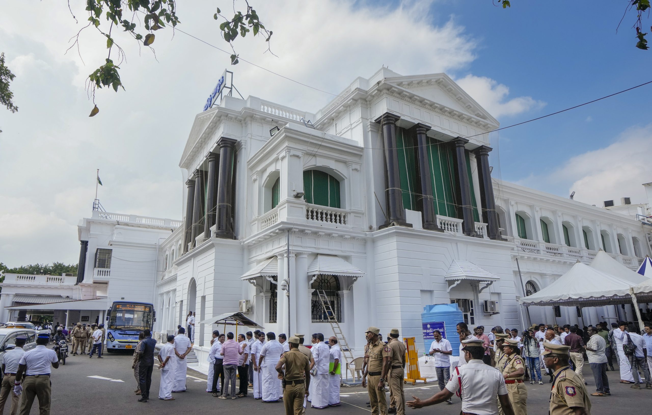 Chennai: Security personnel stand guard during the Assembly session outside the Fort St. George, in Chennai, Tamil Nadu, Tuesday, Oct. 14, 2025. (PTI Photo/R Senthilkumar)(PTI10_14_2025_000089B)