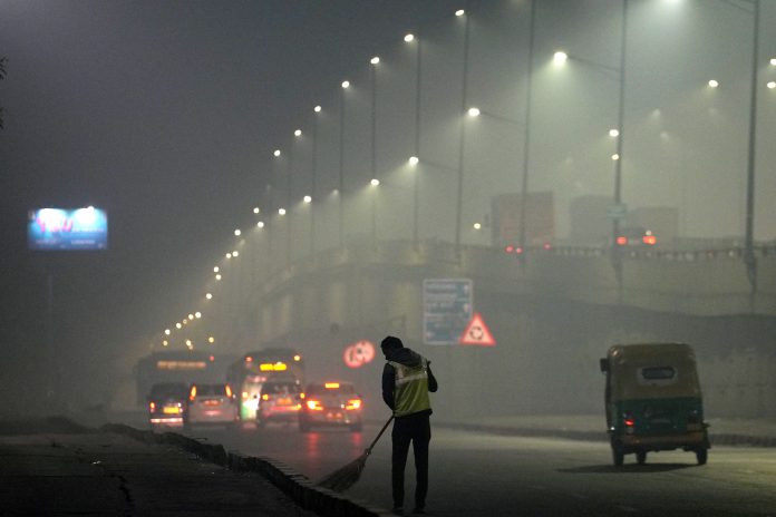 New Delhi: A sanitation worker cleans a road on a cold and smoggy winter morning, as air quality remains poor in the national capital, in New Delhi, Thursday, Nov. 27, 2025. (PTI Photo/Kamal Kishore)(PTI11_27_2025_000020B)