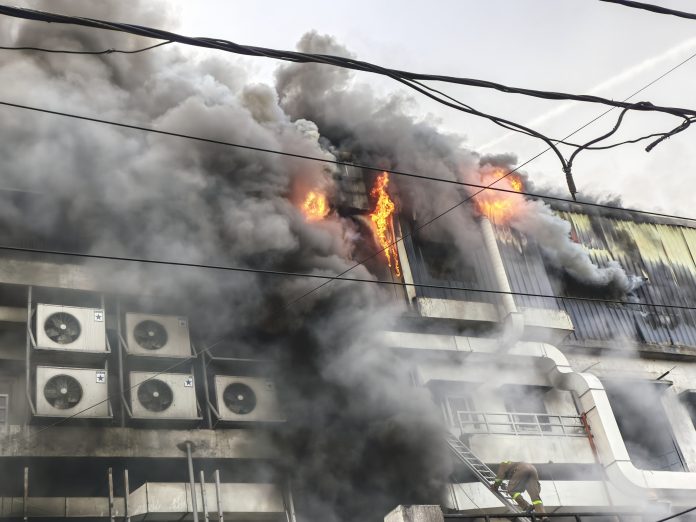 Noida: Flames and smoke billow after a fire broke out at a company building, in Noida, Uttar Pradesh, Thursday, March 12, 2026. (PTI Photo)(PTI03_12_2026_000016B)