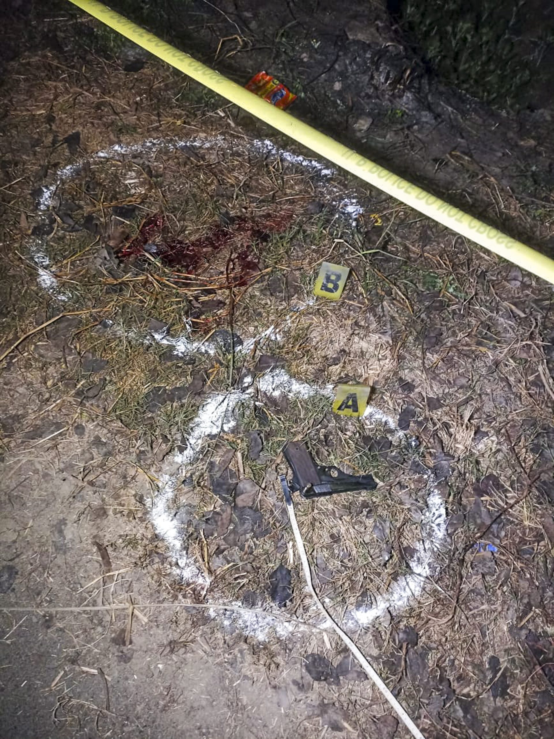 Bulandshahr: A bloodstained patch of ground and a pistol lie inside marked forensic circles at a cordoned-off encounter site, where wanted criminal Zubair alias Peter was shot dead by police during an exchange of fire, in Bulandshahr, Sunday, Dec. 21, 2025. (UP Police Handout via PTI Photo)(PTI12_21_2025_000404B)