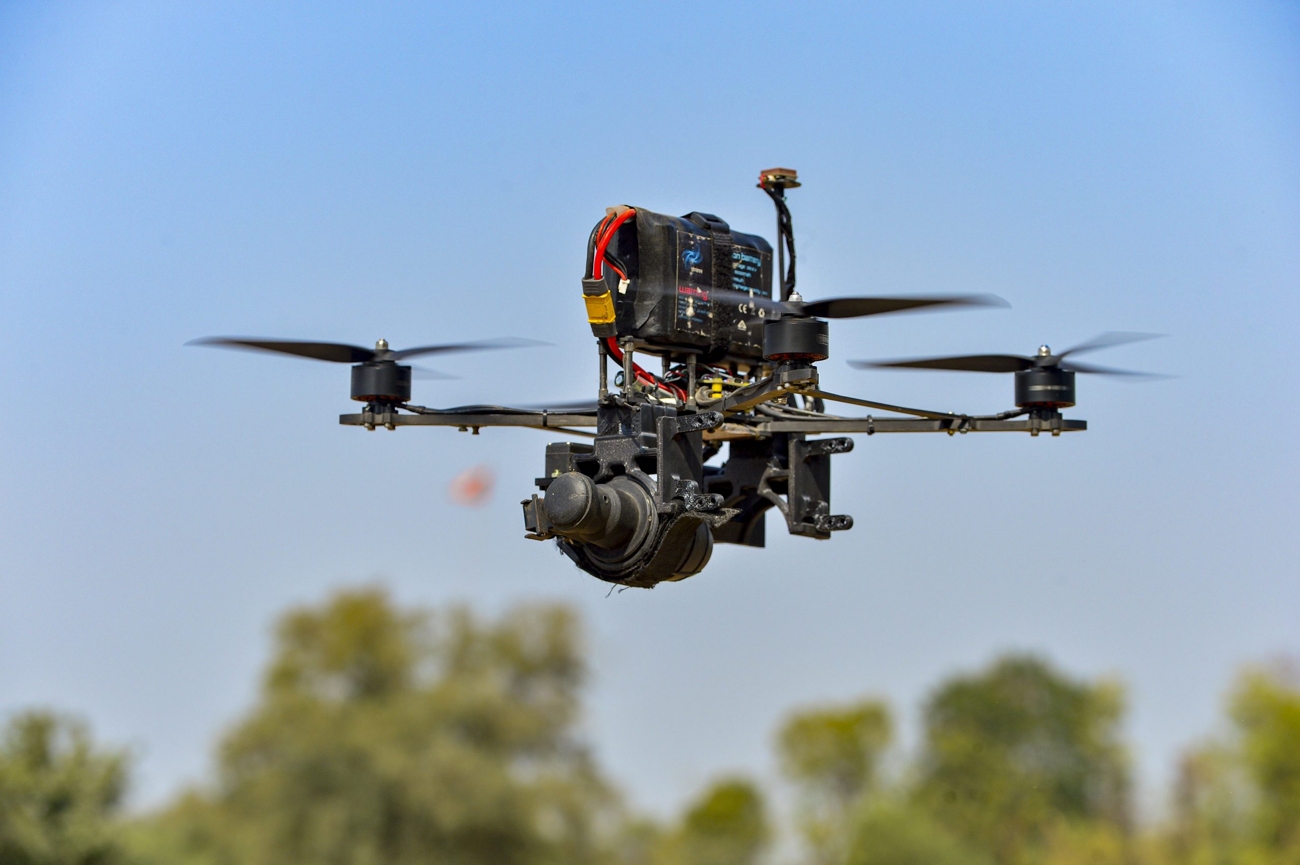 Ahmedabad: An automatic grenade-detonation drone Gati, flown by Keshavkant Sharma, founder of Protthapan Technologies, unseen, on the outskirts of Ahmedabad, Sunday, Jan. 25, 2026. Sharma and his team recently demonstrated the drone at the Pokhran range in the presence of the Indian Army. (Photo)(PTI01_25_2026_000436B)