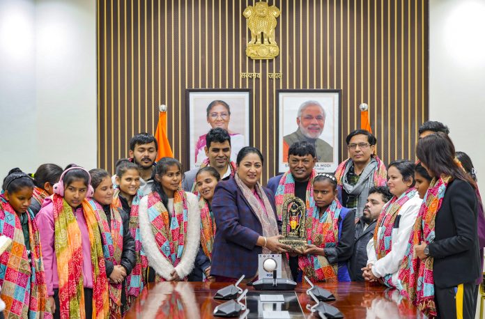 **EDS: THIRD PARTY IMAGE** In this image posted on Jan. 29, 2026, Delhi Chief Minister Rekha Gupta honours the victorious team of the Blind Women's T20 World Cup at the Chief Minister’s office, in New Delhi. Also seen are the team’s coach and members of the Blind Association. (@gupta_rekha/X via PTI Photo)(PTI01_29_2026_000359B)