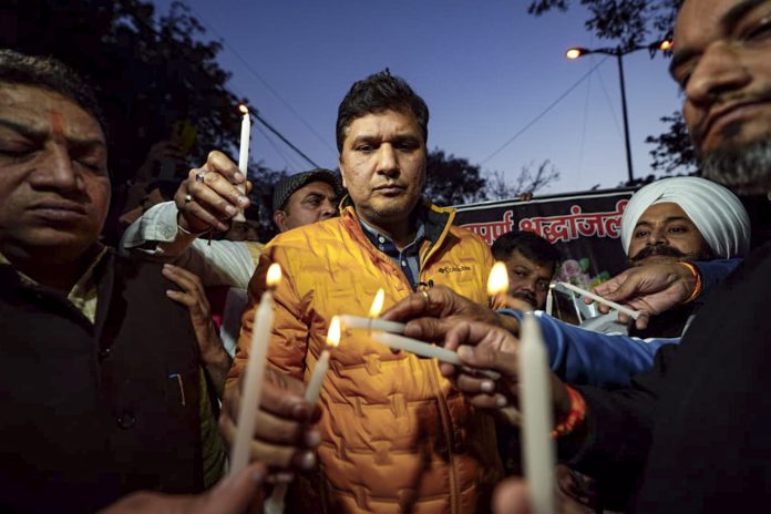 **EDS: THIRD PARTY IMAGE** In this image posted on Feb. 8, 2026, AAP's Delhi unit chief Saurabh Bharadwaj light candles with others in tribute to a biker who died after falling fell into a 15-feet deep pit dug by the Delhi Jal Board, at Janakpuri area, in New Delhi. Kamal Dhyani, an employee of a private bank in Rohini's Sector 10, was returning home on the intervening night of Thursday and Friday when he fell into a pit dug by the DJB for a sewer pipeline restoration project. (@AAPDelhi/X via PTI Photo) (PTI02_08_2026_000635B)