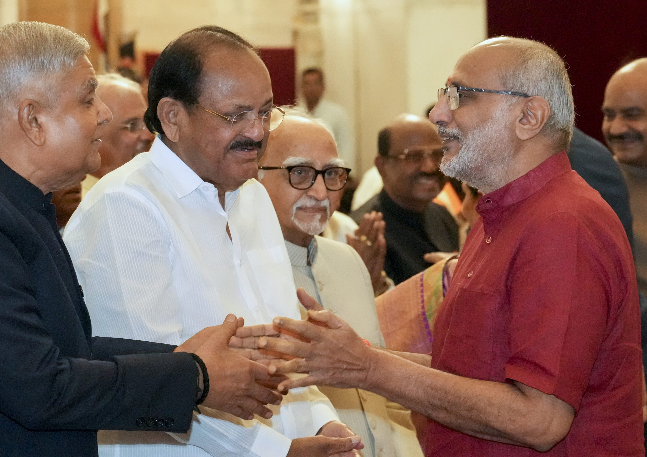 New Delhi: Vice-President-elect CP Radhakrishnan with former vice-presidents Jagdeep Dhankhar and M Venkaiah Naidu during his swearing-in ceremony as the 15th Vice-President of India, at Rashtrapati Bhavan, in New Delhi, Friday, Sept. 12, 2025. (PTI Photo/Kamal Kishore)(PTI09_12_2025_000043B)