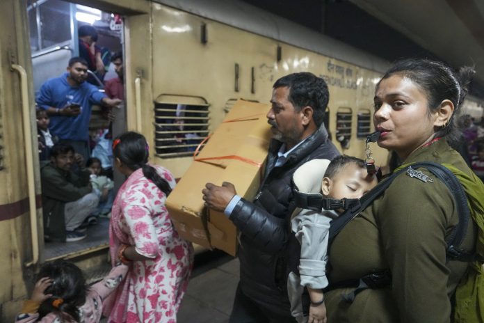 **EDS, YEARENDERS 2025: EDITOR’S PICK** New Delhi: A RPF official carrying her child manages a crowd of passengers at the New Delhi Railway Station, in New Delhi, Sunday, Feb. 16, 2025. At least 18 people were killed and more than a dozen injured in a stampede that broke out late Saturday night at the crowded railway station in the national capital. (PTI Photo/Kamal Kishore) (PTI02_16_2025_000319B)(PTI12_31_2025_000322B)