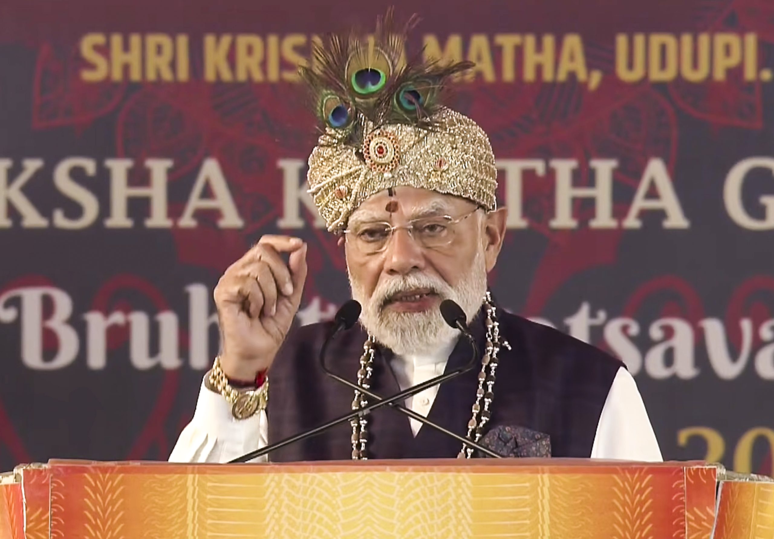 **EDS: THIRD PARTY IMAGE** In this screenshot from a video posted on Nov. 28, 2025, Prime Minister Narendra Modi addresses a gathering during 'Laksha Kantha Gita Parayana' programme at Sri Krishna Mutt, in Udupi, Karnataka. (@NarendraModi/YT via PTI Photo)(PTI11_28_2025_000107B)