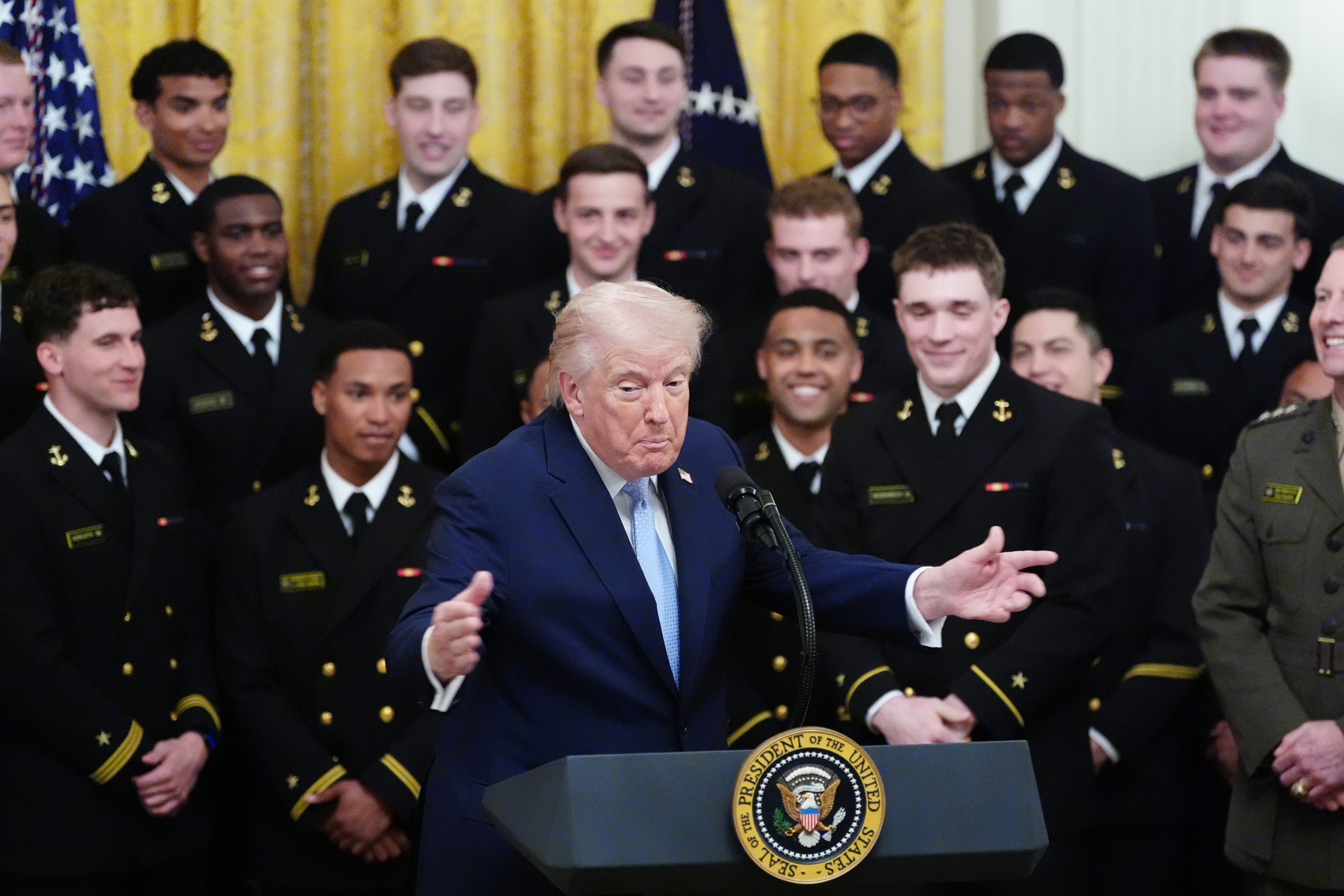 President Donald Trump speaks during the Commander-in-Chief's Trophy presentation with the Navy Midshipmen football team in the East Room of the White House, Friday, March 20, 2026, in Washington. (AP/PTI Photo)(AP03_20_2026_000359B)