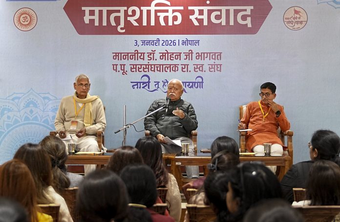 Bhopal: RSS chief Mohan Bhagwat, centre, speaks during 'Matrishakti Samvad' event, in Bhopal, Saturday, Jan. 3, 2026. (PTI Photo)(PTI01_03_2026_000375B)