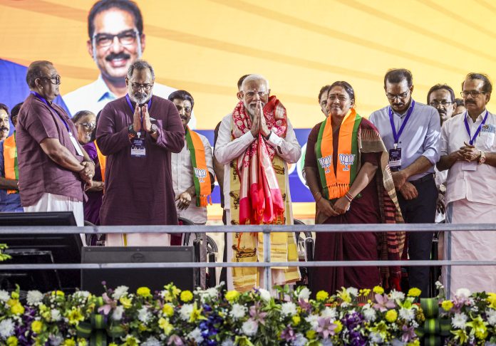 **EDS: THIRD PARTY IMAGE** In this image posted on March 11 2026, Prime Minister Narendra Modi during a public meeting, in Ernakulam, Kerala. BJP state President Rajeev Chandrasekhar and others are also seen.(narendramodi.in via PTI Photo)(PTI03_11_2026_000269B)