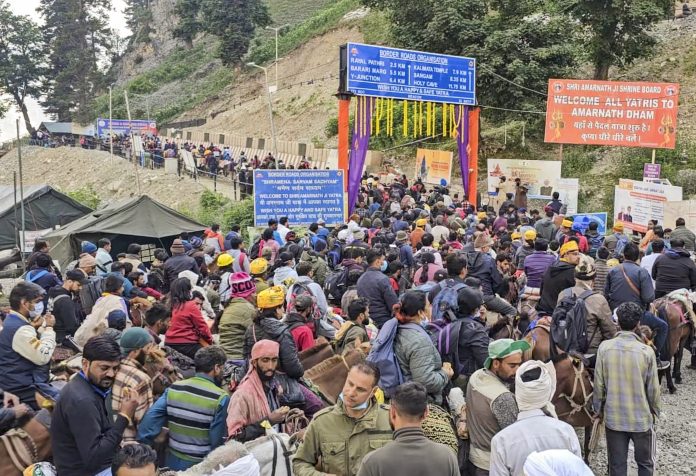 Baltal: People during the annual pilgrimage to the holy cave shrine of Amarnath, at Baltal, in Ganderbal district, J&K, Friday, July 4, 2025. (PTI Photo)(PTI07_04_2025_000296B)