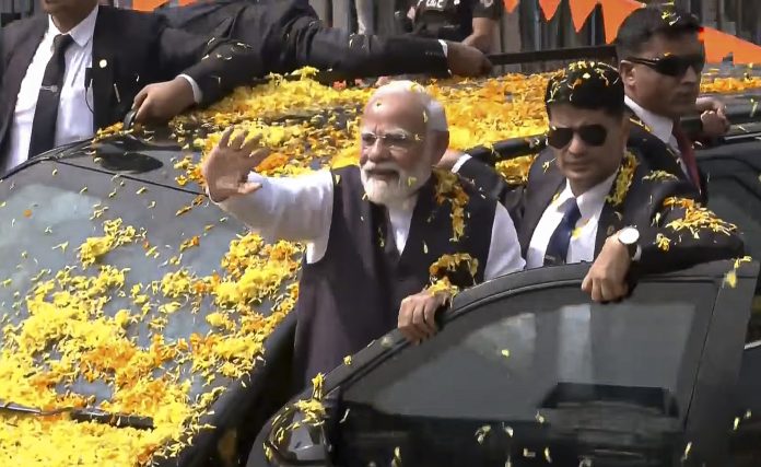 मोदी ने इसका प्रत्युत्तर देते हुए सड़क के दोनों ओर खड़े लोगों पर फूल फेंके।