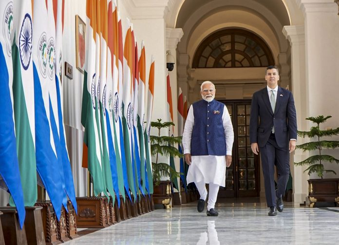 **EDS: THIRD PARTY** In this image released by @MEAIndia via X, Prime Minister Narendra Modi with President of Paraguay, Santiago Pena prior to a meeting at the Hyderabad House, in New Delhi, Monday, June 2, 2025. (@MEAIndia via PTI Photo) (PTI06_02_2025_000318B)