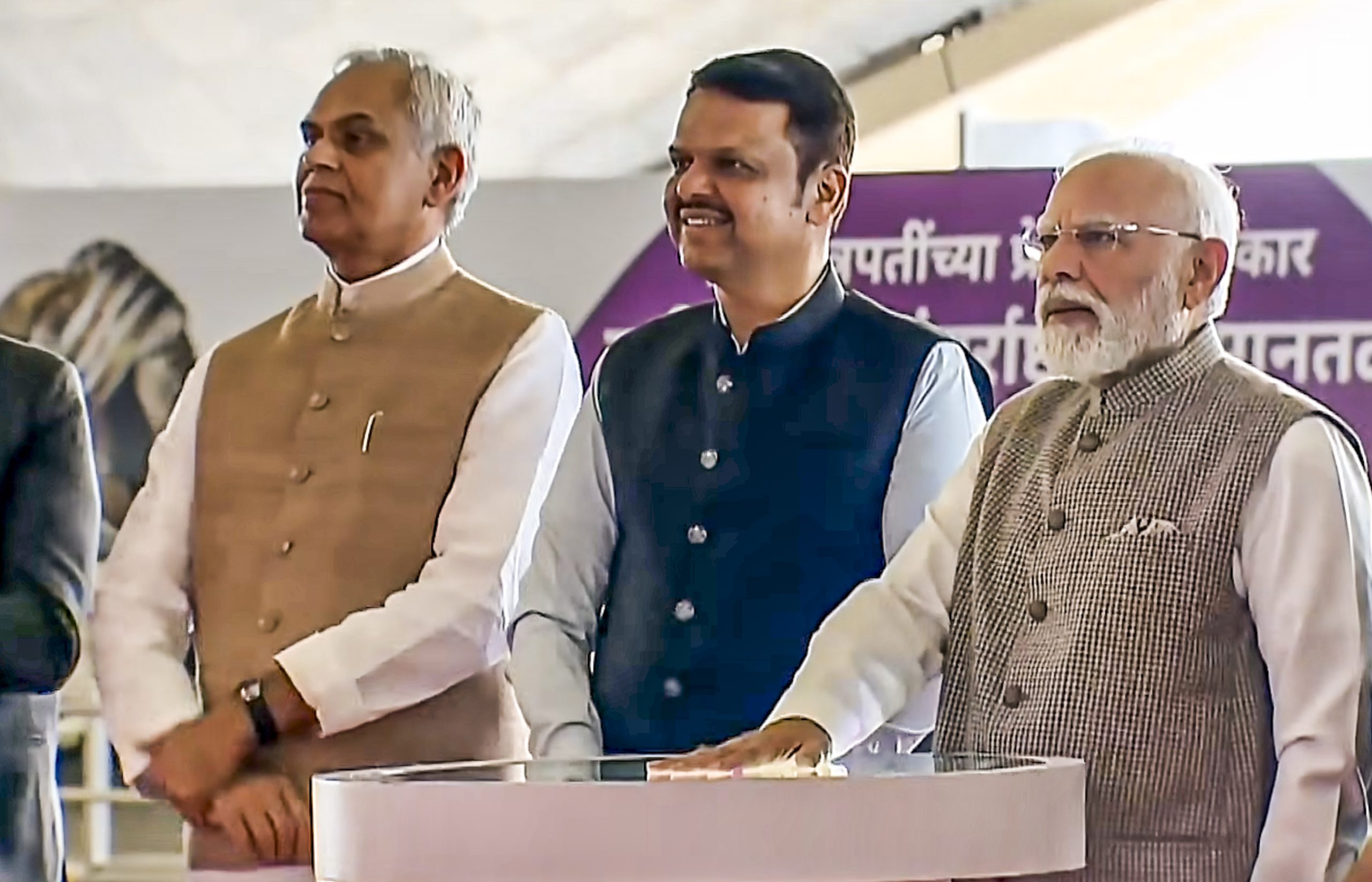 **EDS: THIRD PARTY IMAGE** In this screengrab from a video posted on Oct. 8, 2025, Prime Minister Narendra Modi inaugurates Phase 1 of the Navi Mumbai International Airport (NMIA). Maharashtra Governor Acharya Devvrat and state Chief Minister Devendra Fadnavis also seen. (@NarendraModi via PTI Photo)(PTI10_08_2025_000236B)