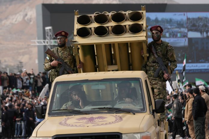 New Syrian army soldiers stand next to rocket launchers during a parade marking the first anniversary of the ousting of former President Bashar Assad in Damascus, Syria, Monday, Dec. 8, 2025. AP/PTI(AP12_08_2025_000398B)