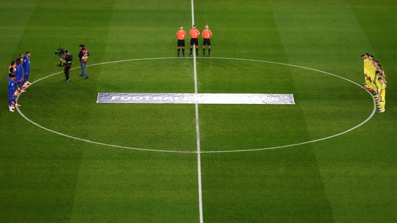 राष्ट्रीय गान गाए जाने के बाद — जिसमें फ्रांस का “ला मार्सेयेज़” भी भावनात्मक रूप से आ कैपेला शैली में गाया गया — खिलाड़ी मध्य वृत्त में पहुंचे और “फुटबॉल फॉर पीस” लिखे बैनर के पास खड़े हुए। वे अपने साथियों के साथ बांहों में बांहें डालकर खड़े रहे, कुछ ने सिर झुकाकर मौन का पालन किया।