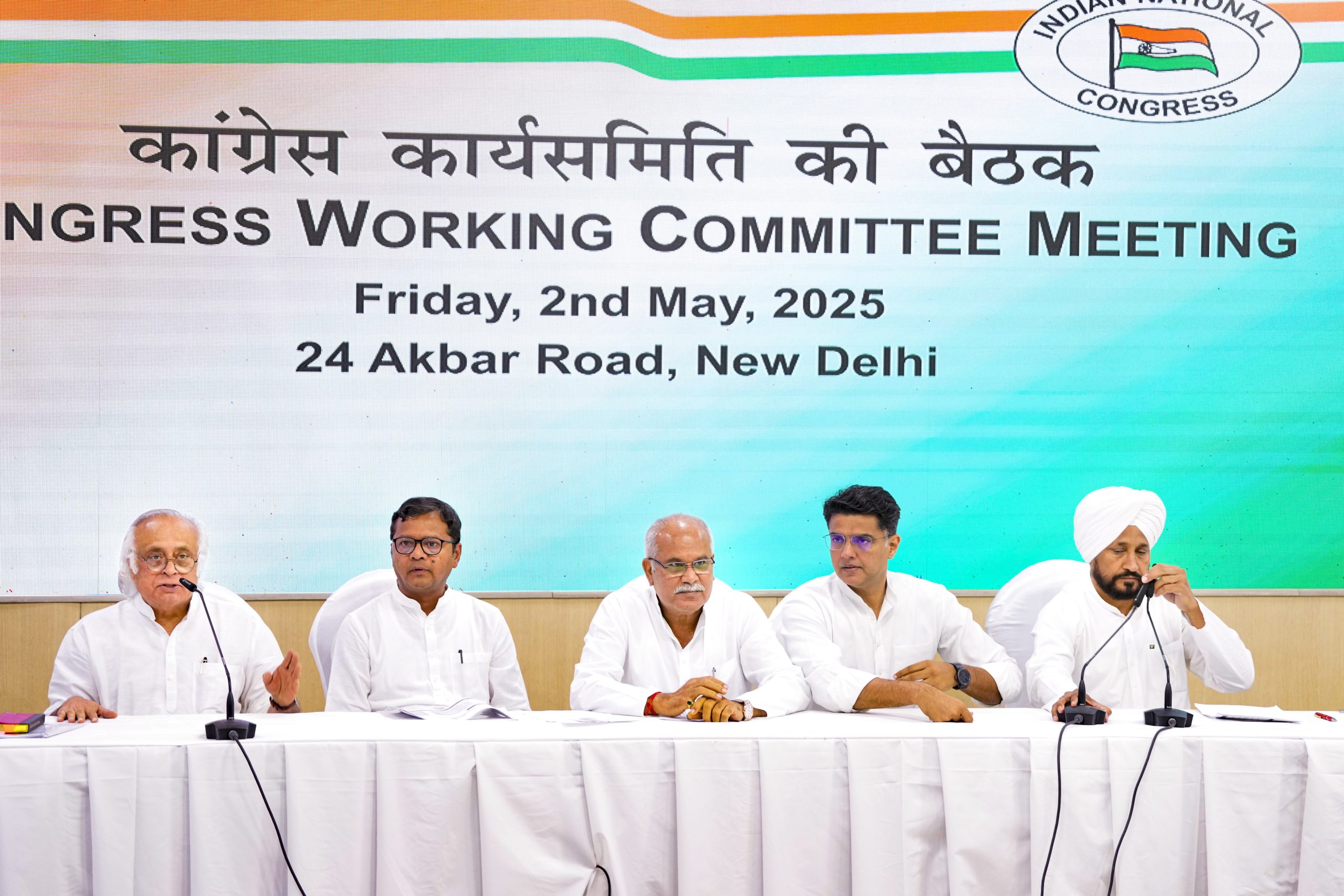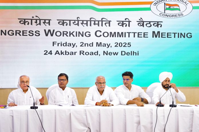 New Delhi: Congress leaders Jairam Ramesh, Saptagiri Ulaka, Bhupesh Baghel, Sachin Pilot and Charanjit Singh Channi address a press conference after the Congress Working Committee (CWC) meeting, in New Delhi, Friday, May 2, 2025. (PTI Photo/Ravi Choudhary)(PTI05_02_2025_000427B)